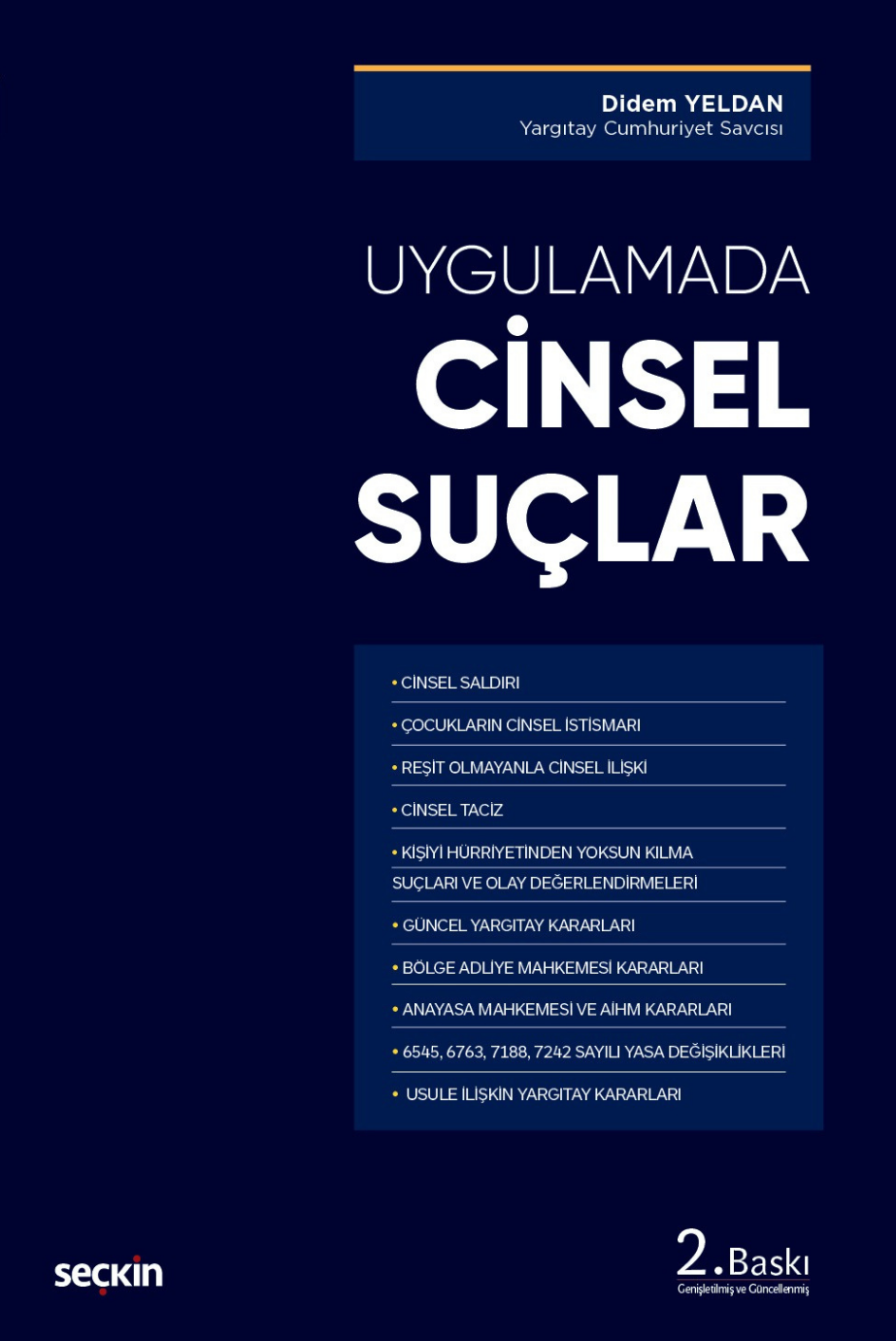 Kitabın tamamı güncellenmiş bu ikinci baskısında; konularla ilgili Yargıtay Ceza Genel Kurulu ve Ceza Dairelerinin, Bölge Adliye Mahkemelerinin son çıkan kararları ilgili bölümlere eklenmiş, cinsel saldırı, çocuğun cinsel istismarı, reşit olmayanla cinsel ilişki, cinsel taciz ve hürriyetten yoksun kılma suçları bu kararlar ışığında açıklanmıştır. İncelenen suçlarla ilgili görevli mahkemeler, yargılama usulleri, olağan ve olağanüstü zamanaşımı süreleri, benzer suçlar ile aralarındaki farklılıklar, iştirak, teşebbüs ve teselsül konuları incelenmiş, olay değerlendirmeleri yapılmıştır.